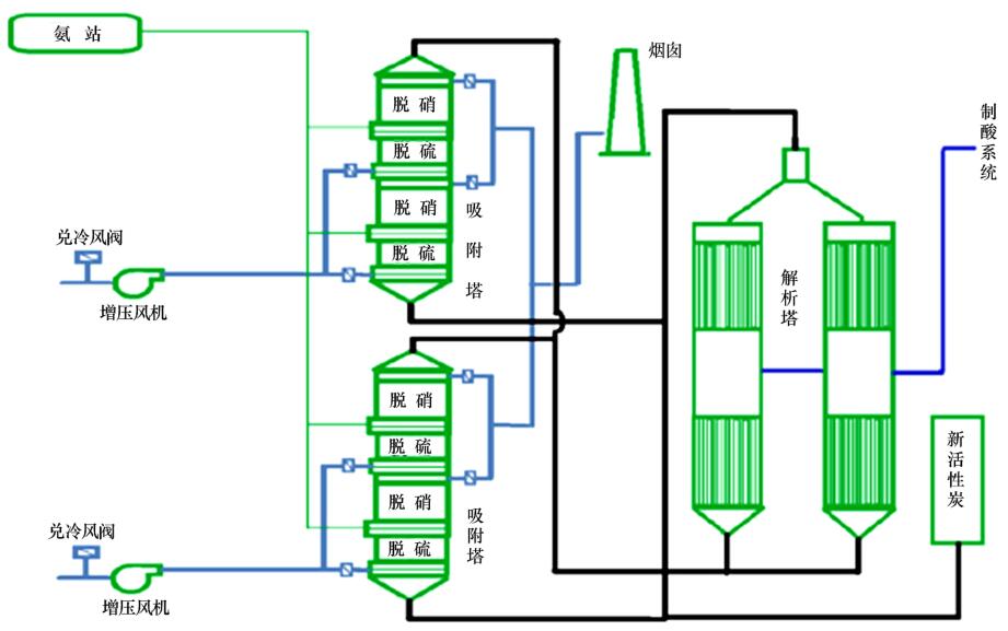 SO2通過活性炭的吸附、解析作用,再經過觸媒的催化氧化制成濃硫酸,實現了資源回收利用。通過脫硫段后,在上升的煙氣中進行噴氨,進入脫硝段后在活性炭的催化作用下NOx轉化為氮氣和水進行脫硝。