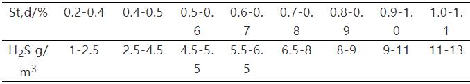 焦爐爐體竄漏會導致炭化室荒煤氣進入燃燒室,荒煤氣燃燒生成SO2。荒煤氣中H2S含量主要取決于裝爐煤的全硫含量,煤中約15-35%硫轉入到荒煤氣中,其中95%以上H2S形式存在,荒煤氣中H2S含量與裝爐煤全硫含量關系見表2[7]。為便于計算荒煤氣中硫化物以H2S計,含量為5500-13000mg/m3,噸干煤煤氣產率320Nm3,若假設竄漏率1%,則竄漏荒煤氣中H2S燃燒生成的SO2約為50-120 mg/m3,遠超過限制排放標準。